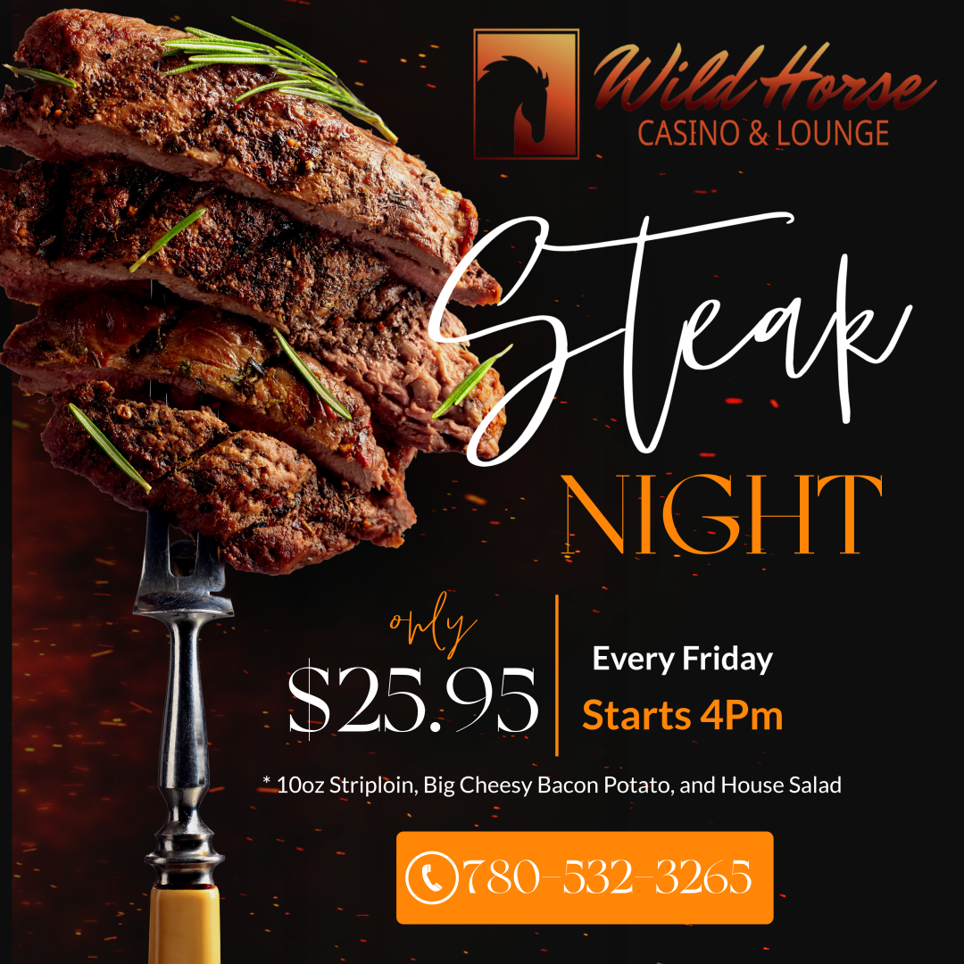 It’s a full house of food and entertainment at Wild HorseCasino & Lounge featuring the latest trends in cuisine, off-track pari-mutuel betting and fully-updated gaming area. It’s where Grande Prairie goes to escape the everyday and reap their rewards. Every Friday and Saturday there is free live musical entertainment. Watch for slot tournaments and other fun events held on a regular basis at the Wild Horse. Gaming hours are 10 a.m. to 1a.m.